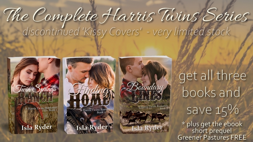 Get the full Harris Twins series paperbacks in the now discontinued 'Kissy Covers' my stock of these is very limited and I'd love to keep them in sets so readers can have matching editions.
